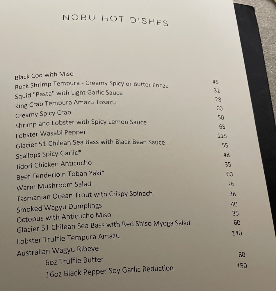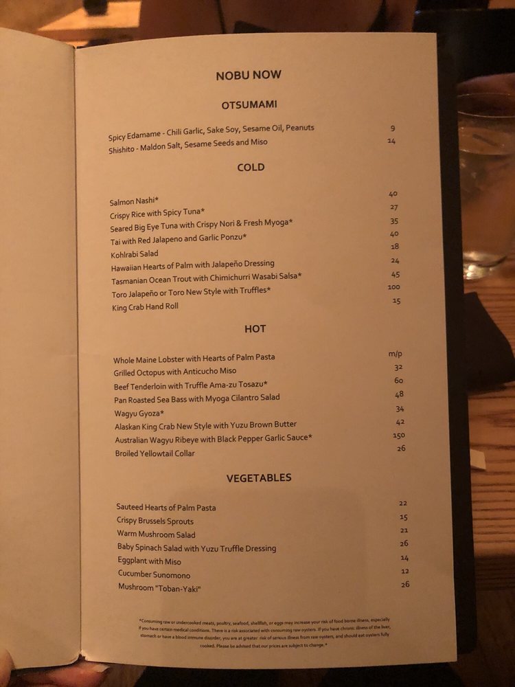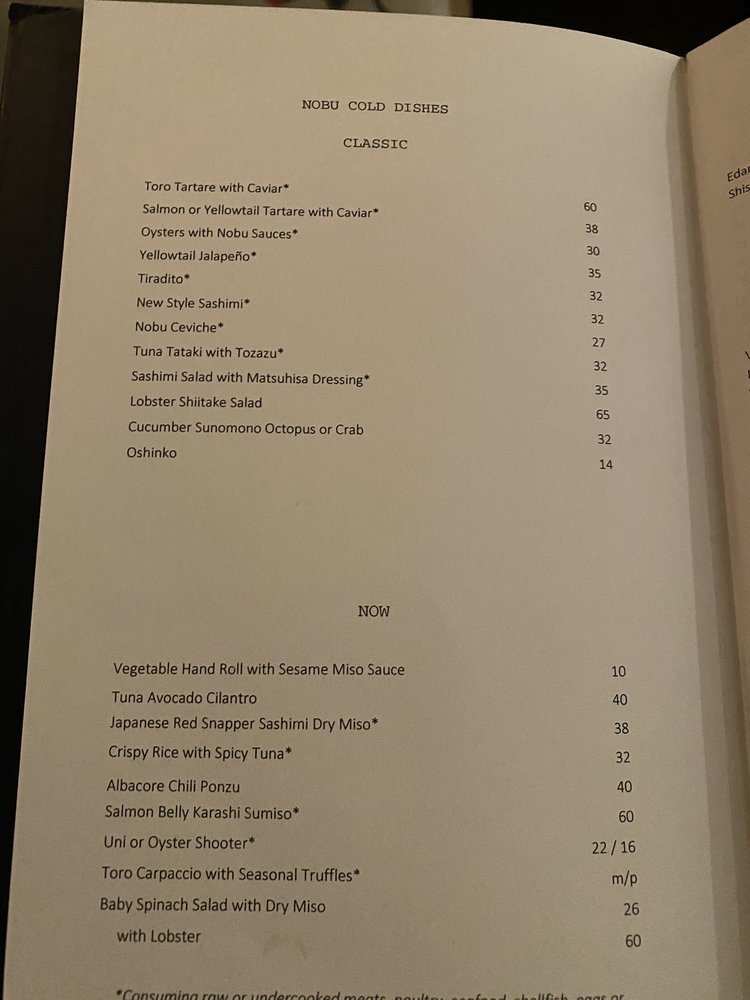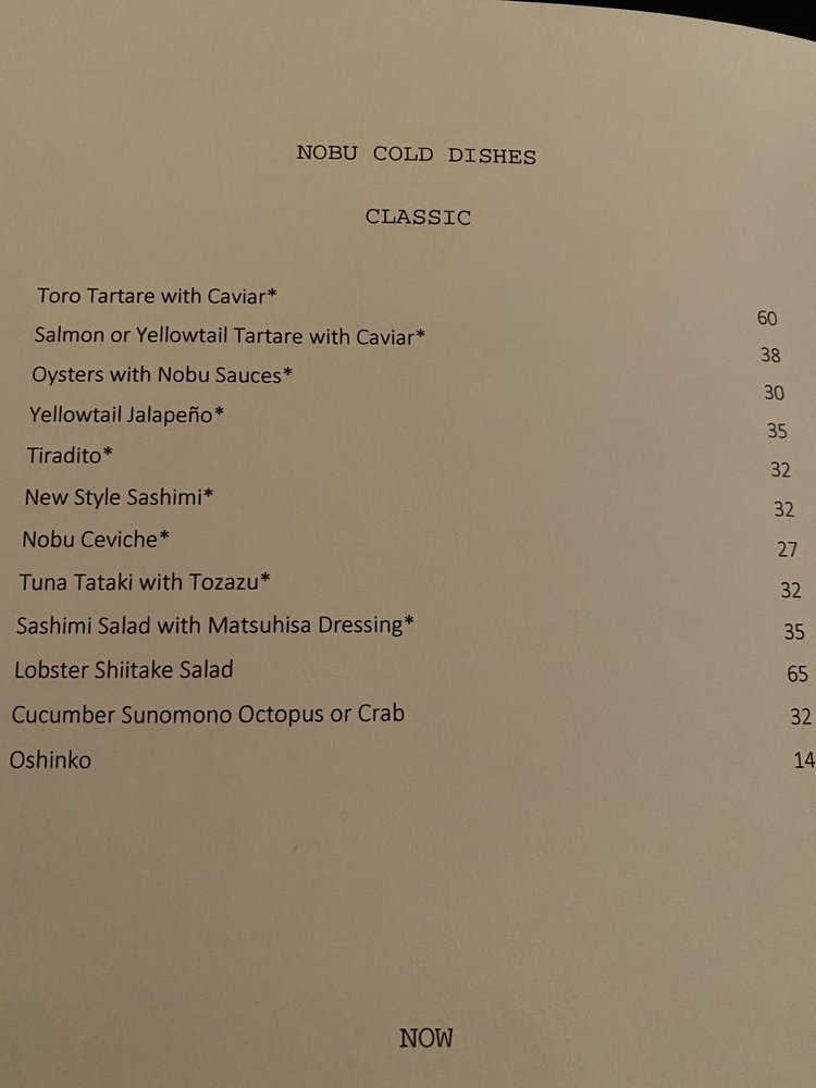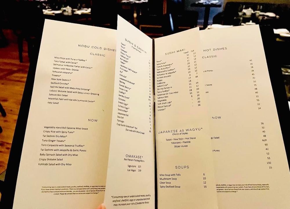 Introducing the menu at Nobu Las Vegas at Virgin Hotel, guests can expect a diverse selection of exquisite Japanese cuisine. From flavorful soups like Mushroom Soup and Lobster Miso Soup to refreshing salads such as Snow Crab Sashimi Salad and Cucumber Sunomono, the menu offers a wide range of options to satisfy every palate. Indulge in fresh sushi and sashimi choices like Tuna, Salmon, and Sea Urchin, expertly prepared by skilled chefs. Customers rave about the exceptional service and ambiance, making dining at Nobu a memorable experience. Don't miss out on signature dishes like Chilean sea bass with amazu ponzu sauce and Black cod butter lettuce for a culinary journey that will delight your taste buds. Nobu Las Vegas at Virgin Hotel promises a sophisticated dining experience that is worth every penny.